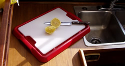 No more slipping and no more spills on the galley floor or cockpit. Tray holds liquids from cutting board and rubber feet keep board in place even while underway!